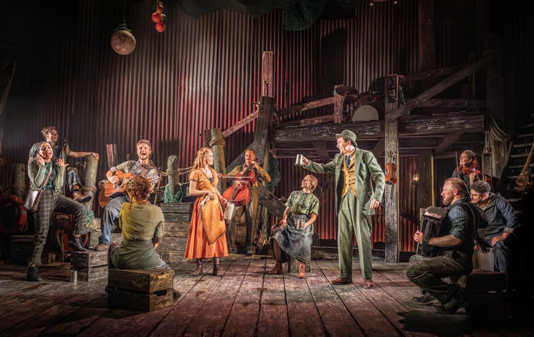 Leading the exceptional ensemble, John Dagleish as Benjamin Button and Clare Foster as Elowen Keene delivered standout performances, infusing the story with depth, heart, and compassion. Their portrayal of a relationship spanning over 50 years was nothing short of captivating. Dagleish, effortlessly ageless, brought Benjamin to life across multiple stages of his life, skilfully conveying a 60-year lifespan with subtle shifts in physicality and vocal delivery. Thanks to these nuanced changes, it was easy to suspend disbelief and fully engage with each of Benjamin's ages, without relying on prosthetics or heavy makeup. His voice, rich and clear, blended seamlessly with the beautiful choral ensemble moments, perfectly complementing the folk-inspired score.